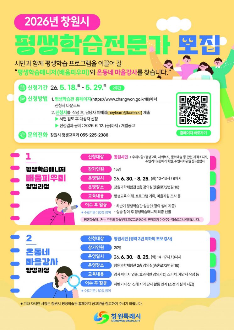 경남 창원특례시는 시민이 주도하는 평생학습 환경 조성을 위해 '2026년 창원시 평생학습전문가 양성과정'을 운영하고, 평생학습매니저 '배움피우미'와 온동네 마을강사를 공개 모집한다.
