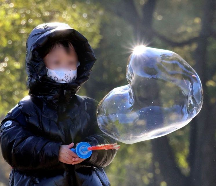엄마 아빠 손잡고 반포한강공원을 찾은 어린이가 물방울 놀이 중 신기하게도 물방울이 아름다운 하트 형상을 하고 있다. 사진=조용준 기자 jun21@