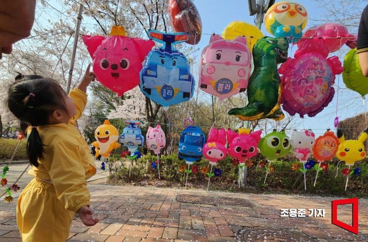 봄기운이 무르익어 가는 휴일. 공원에 나들이를 온 한 아이가 캐릭터풍선을 진지하게 고르고 있다. 마음에 쏙 드는 풍선을 골라 기분좋은 나들이가 되었기를. 사진=조용준 기자 jun21@
