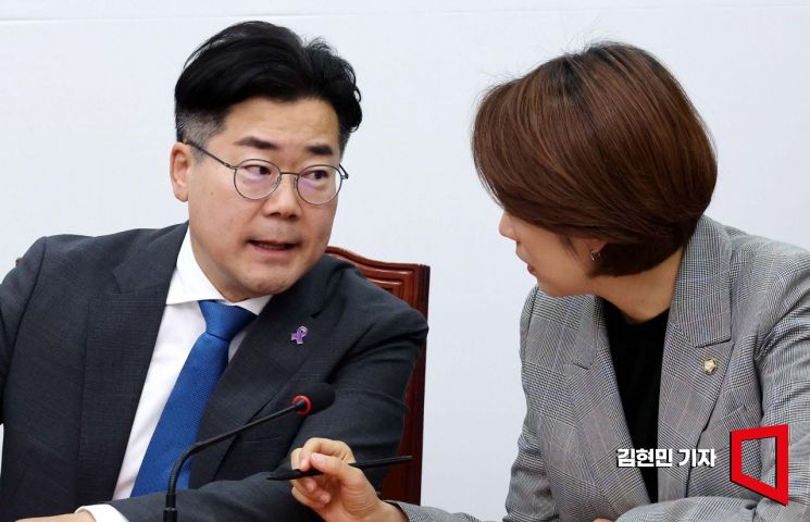 박찬대 더불어민주당 원내대표가 10일 국회에서 열린 최고위원회의에서 고민정 최고위원과 대화하고 있다.사진=김현민 기자 kimhyun81@