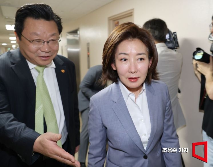 나경원 국민의힘 당선인(전 저출산고령사회위원회 부위원장)이 10일 서울 종로 정부서울청사에서 저출산고령사회위원회를 방문, 주형환 부위원장의 안내를 받고 있다. 사진=조용준 기자 jun21@