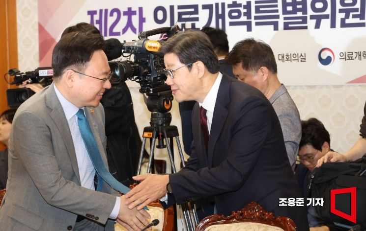 노연홍 의료개혁특별위원회 위원장(오른쪽)이 10일 서울 종로구 정부서울청사에서 열린 제2차 의료개혁특별위원회 회의에 참석, 조규홍 보건복지부 장관과 인사하고 있다. 사진=조용준 기자 jun21@