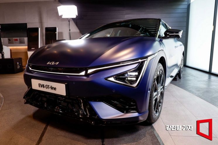 13일 서울 강남구 기아360에서 열린 '더 뉴 EV6 디자인&상품 발표회'에서 EV6 GT라인이 전시돼 있다. 기아는 EV6의 상품성을 대폭 강화하면서도 전 트림의 가격을 동결해 뛰어난 상품 경쟁력을 확보했다. 2021년 8월 출시된 EV6는 전기차 전용 플랫폼 E-GMP 기반의 기아 최초 전용 전기차 모델로 글로벌 시장에서 누적 21만 대 이상의 판매를 기록했다.
