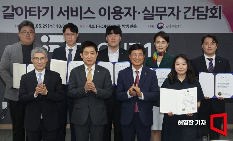 금융위원회 주관으로 29일 서울 마포 프런트원에서 열린 ‘대출 갈아타기 서비스 이용자·실무자 간담회에서 대출 갈아타기 서비스 유공자들에게 표창장을 수여한 후 김주현 금융위원장 등 참석자와 수상자들이 기념촬영을 하고 있다.