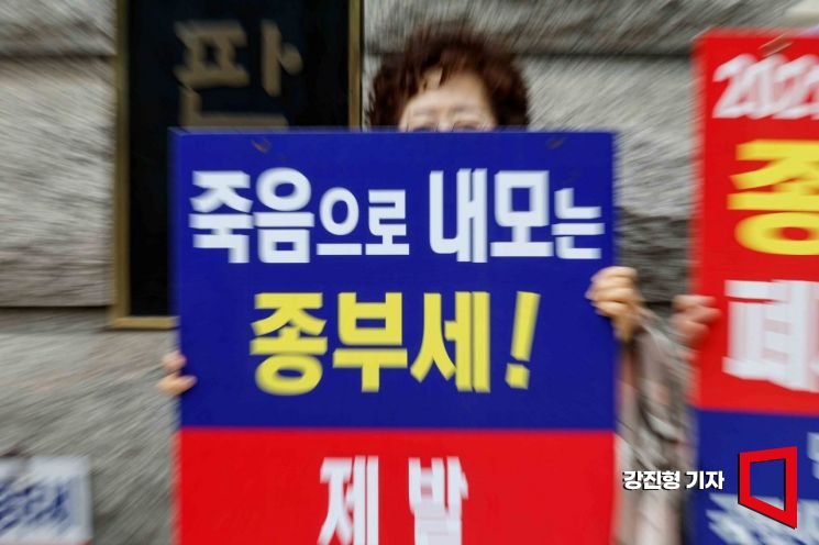 30일 서울 종로구 헌법재판소 앞에서 시민들이 종부세를 규탄하는 피켓시위를 하고 있다. 이날 헌재에서는 종합부동산세의 납세 의무와 기준 등을 정한 종합부동산세법, KBS 수신료 분리 징수의 근거 조항인 방송법 시행령, 양심적 병역거부자 등에게 대체 복무 의무를 부여하는 병역법·대체역법에 관한 헌법소원 사건을 비롯해 헌정사 최초 '검사 탄핵' 사건에 대한 선고를 진행한다.