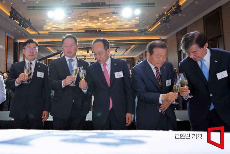 박찬대 더불어민주당 원내대표, 최태원 대한상의 회장, 추경호 국민의힘 원내대표, 양재생 부상상의 회장, 조국 조국혁신당 대표가 3일 서울 여의도 콘래드호텔 에서 열린 대한상공회의소 주최 제22대 국회의원 환영 리셉션에서 건배하고 있다. 사진=국회사진기자단