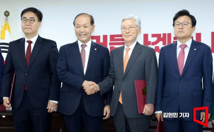 황우여 국민의힘 비상대책위원장이 4일 서울 여의도 당사에서 열린 당헌당규개정특위 임명장 수여식 및 1차 회의에서 여상규 위원장을 비롯한 위원들과 기념촬영을 하고 있다. 사진=김현민 기자 kimhyun81@