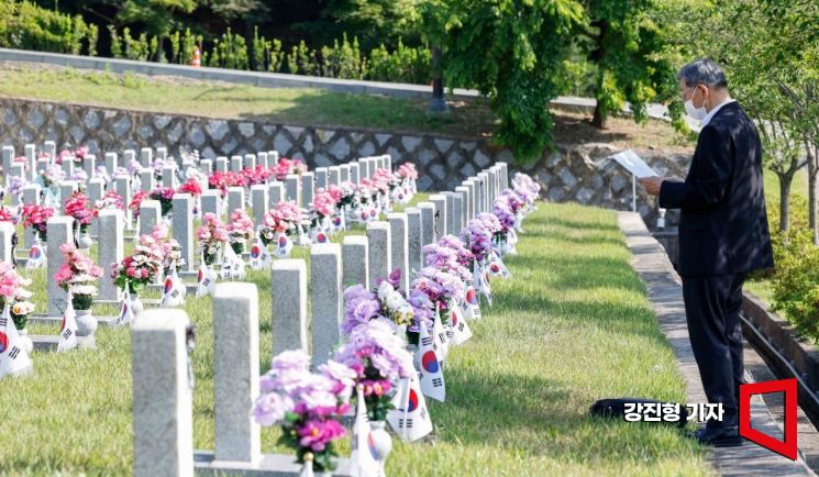 제69주년 현충일을 앞둔 5일 서울 동작구 국립서울현충원 3묘역에서 월남전 당시 육군 맹호부대 1연대 중대장이었던 예비역이 전쟁중에 사망한 전우들의 이름을 부르고 있다.