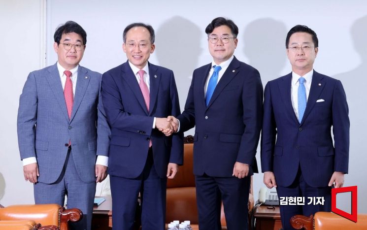 추경호 국민의힘 원내대표와 박찬대 더불어민주당 원내대표가 5일 국회에서 원 구성 등을 논의하기 위해 회동하고 있다. 왼쪽부터 배준영 국민의힘 원내수석부대표, 추 원내대표, 박 더불어민주다 원내대표, 박성준 원내수석부대표. 사진=김현민 기자 kimhyun81@