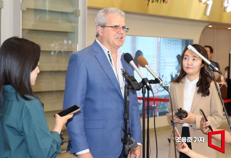 5일 인천국제공항을 통해 입국한 미국 액트지오(Act-Geo)의 비토르 아브레우 박사가 기자들의 질문을 답하고 있다. 그는 방한 중 석유 매장 가능성을 분석한데 대해 설명할 것으로 전해졌다. 사진=조용준 기자 jun21@