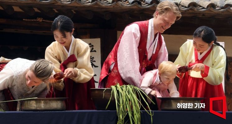 국립민속박물관에서 단오(6월10일)를 맞아 '여름의 시작 단오' 세시행사를 마련하고 5일 박물관네 오촌댁 앞에서 관람객을 대상으로 창포 물에 머리 감기 시연을 했다. 한 외국인 관광객 가족이 머리 감기를 체험하고 있다.