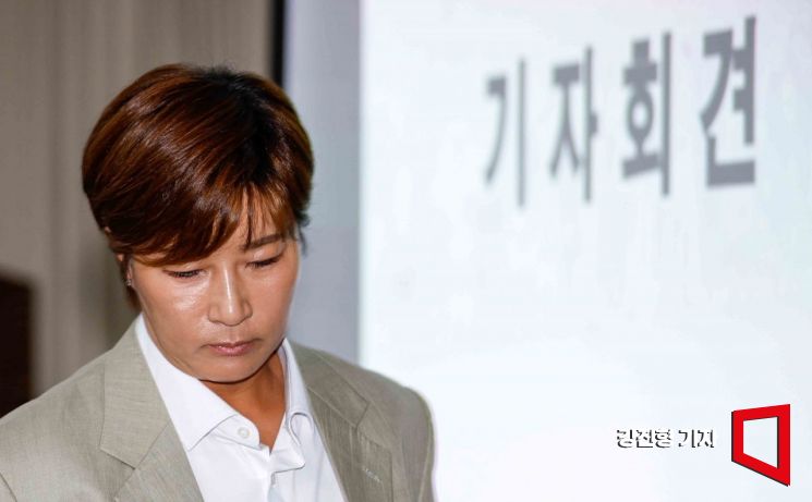 골프선수 출신 방송인 박세리가 18일 서울 강남구 스페이스쉐어 삼성코엑스센터에서 부친의 사문서위조 혐의와 관련해 입장발표하기 위해 기자회견장으로 들어서고 있다.