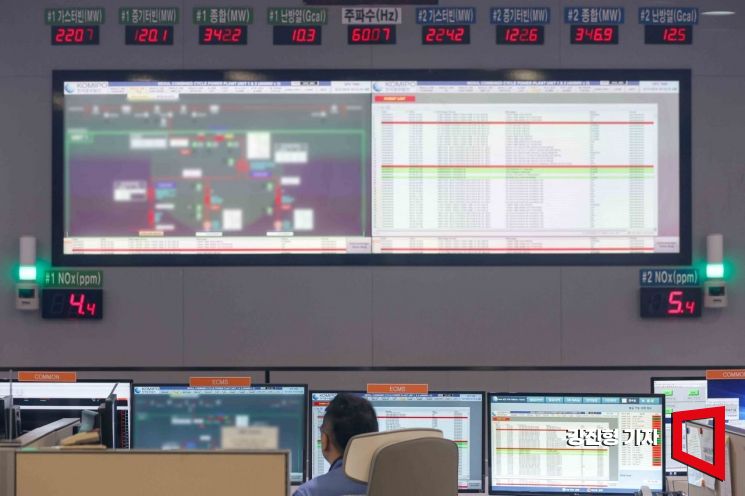 때이른 한여름 폭염이 이어지며 전력 사용량이 급증하고 있는 21일 서울 마포구 한국중부발전 서울발전본부 중앙제어실에서 직원이 발전 출력 현황을 점검하고 있다.
