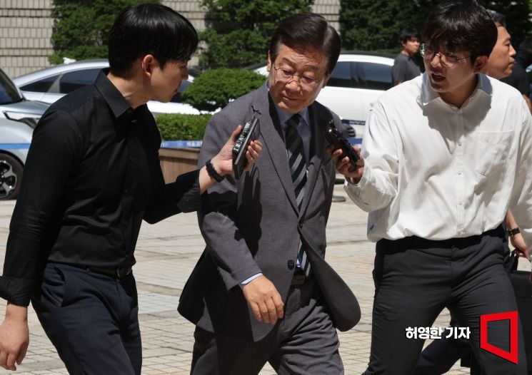 21일 서울 중앙지방법원에서 열린 대장동 배임 및 성남FC 뇌물 사건에 대한 공판에 출석한 이재명 민주당 대표가 기자들의 질문에 답하지 않은 채 법정으로 향하며 환호하는 지지자들에게 인사하고 있다.