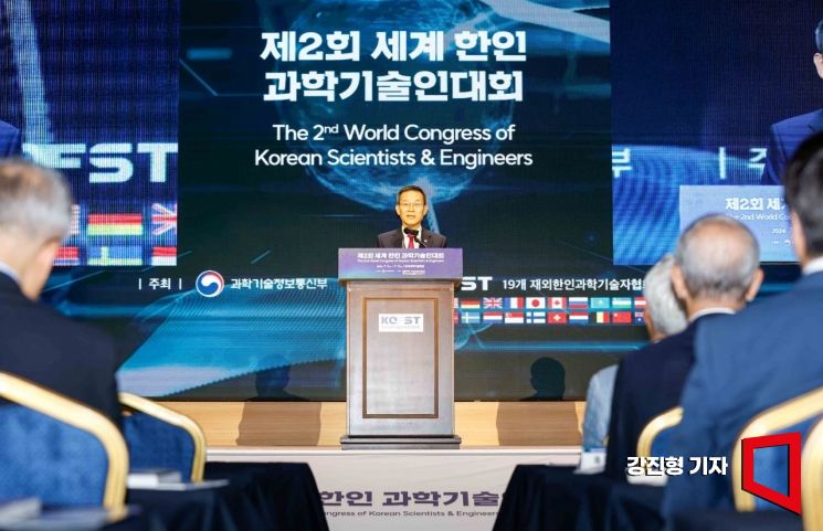 이종호 과학기술정보통신부 장관이 10일 서울 강남구 한국과학기술회관에서 열린 '제2회 세계 한인 과학기술인대회'에 참석해 인사말 하고 있다.