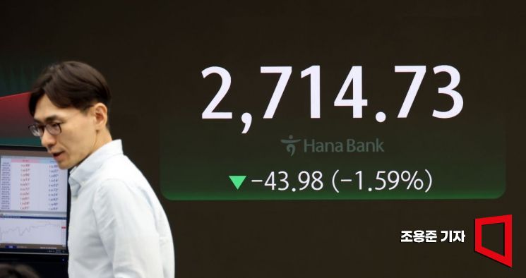 미 증시가 빅테크 실적우려에 2022년 후 최대 폭락하면서 코스피 지수도 전 거래일(2,758.71) 보다 38.97 포인트(-1.41%) 내린 2,719.74에 장을 시작한 25일 서울 중구 하나은행 딜링룸 전광판에 지수가 표시 되고 있다. 사진=조용준 기자 jun21@