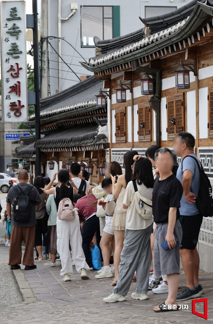 장마가 주춤하면서 폭염이 찾아온 25일 서울 종로구 자하문의 한 삼계탕집을 찾은 많은 손님들이 줄을 서서 입장을 기다리고 있다. 사진=조용준 기자 jun21@