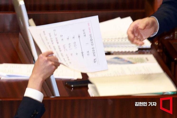 25일 국회에서 열린 본회의에서 '채상병특검법' 재의결 안건에 대한 무기명 투표 결과지가 우원식 국회의장에게 전달되고 있다. 사진=김현민 기자 kimhyun81@