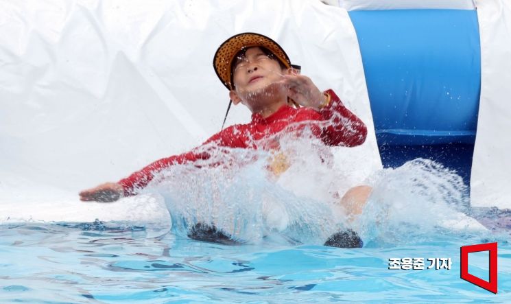 찜통더위가 기승을 부린 26일 서울 종로구 광화문광장에서 열린 2024 서울 썸머비치 행사에서 한 어린이가 워터슬라이드를 타고 있다. 사진=조용준 기자 jun21@