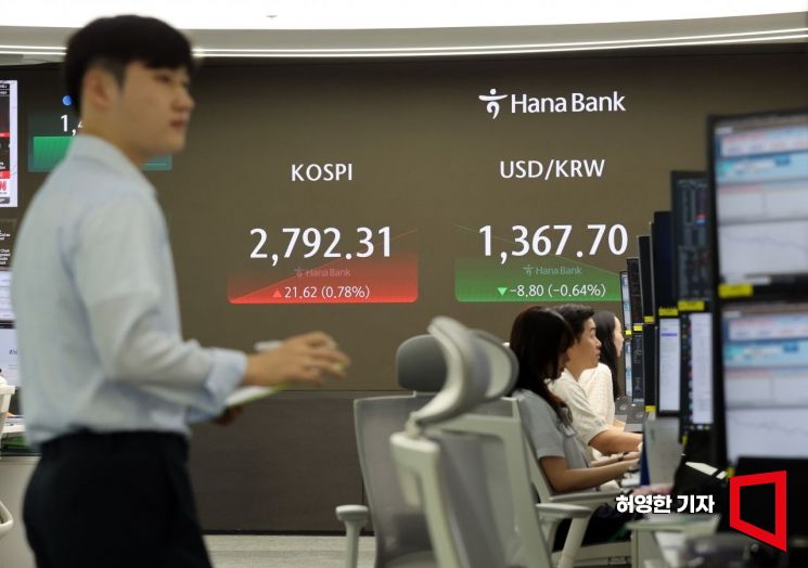 미국 FOMC(연방공개시장위원회)에서 9월 금리인하예고가 발표된 영향으로 뉴욕증시가 일제히 상승한 가운데 코스피는 개장 초 20포인트 이상 상승 출발했고 원달러 환율은 소폭 하락했다. 서울 을지로 하나은행 딜링룸에서 직원들이 업무를 보고 있다.