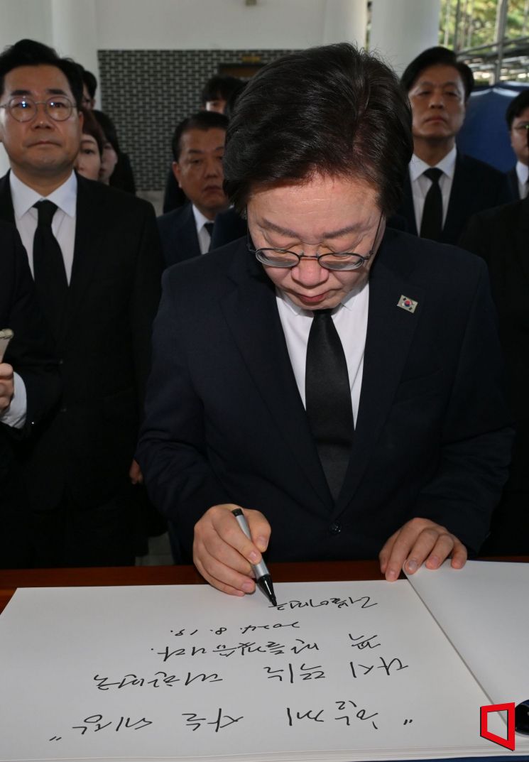 더불어민주당 이재명 대표와 최고위원 등 신임 지도부가 19일 서울 국립현충원을 참배했다. 이 대표가 참배후 방명록을 작성하고 있다.