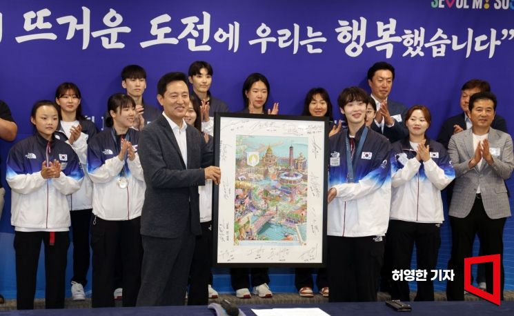 서울시에서 19일 파리올림픽에 출전했던 서울시와 서울시청 소속 선수와 지도자들을 초청해 서울시청에서 격려 오찬 간담회를 열었다. 2연속 올림픽 메달을 획득한 태권도 이다빈 선수가 오세훈 서울시장에게 선수들이 서명한 파리올림픽 포스터를 선물하고 있다.