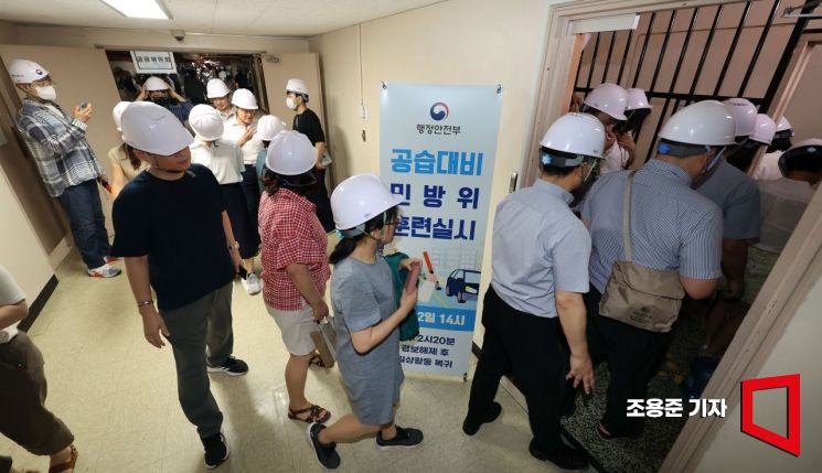 을지훈련 연계, 미사일 공습 대비 민방위 훈련이 열린 22일 서울 종로구 정부서울청사 부처 공무원들이 지하2층 대피소로 대피하고 있다. 사진=조용준 기자 jun21@