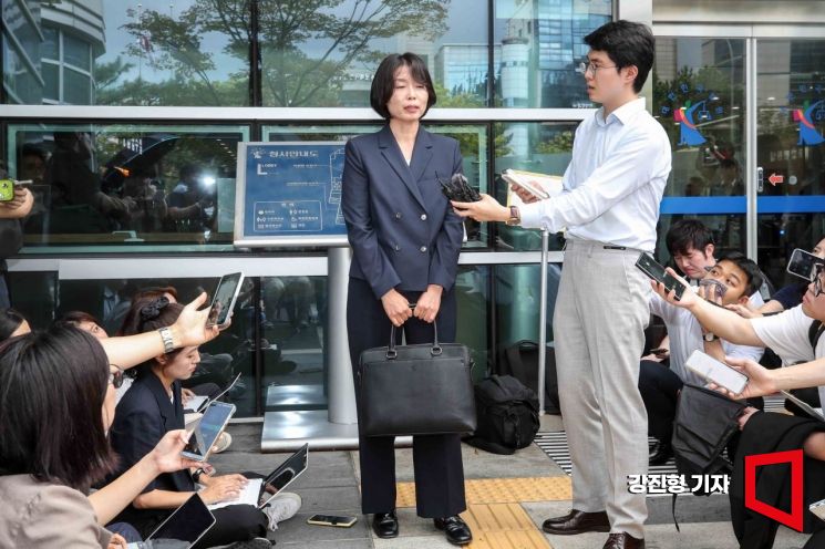 최태원 SK그룹 회장 동거인 김희영 티앤씨재단 이사장이 노소영 아트센터 나비 관장에게 위자료로 20억을 지급하라는 1심 법원 판결이 내려진 22일 서울 서초구 서울가정법원 앞에서 노소영 관장 변호인인 김수정 변호사가 입장을 밝히고 있다.