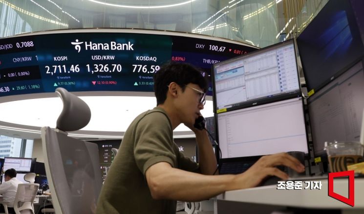 코스피 지수가 전 거래일보다 15.19p(0.54%) 오른 2716.88, 원/달러 환율은 3.0원 내린 1,325.0원으로 장을 시작한 26일 서울 중구 하나은행 본점 딜링룸에서 딜러들이 업무를 보고 있다. 사진=조용준 기자 jun21@