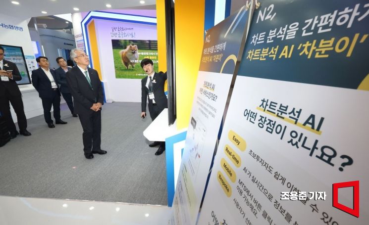 이석준 농협금융지주 회장이 27일 서울 동대문 디자인플라자(DDP)에서 열린 코리아 핀테크 위크 2024에 참석, AI차트분석 시스템을 살펴보고 있다. 사진=조용준 기자 jun21@