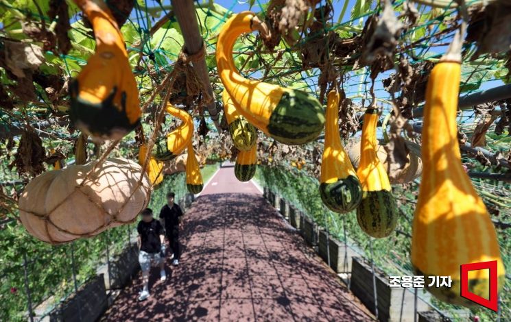 처서를 지나면서 아침 저녁으로 불던 뜨거운 바람이 한풀 꺽인 28일 서울 상암동 하늘공원에 표주박, 호박 등이 익어가고 있다. 사진=조용준 기자 jun21@