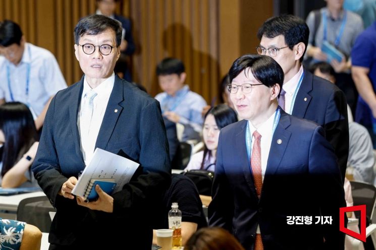 [포토] 컨퍼런스장 들어서는 이창용 총재-김소영 부위원장