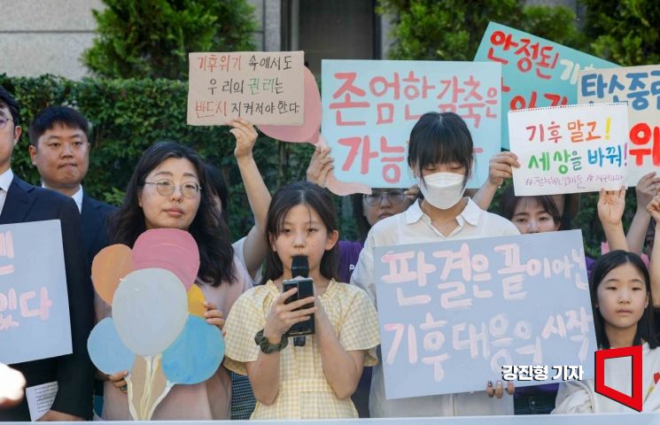 우리 정부의 기후 위기 대응이 국민의 기본권을 침해할 수 있다는 헌법재판소의 판단이 나온 29일 서울 종로구 헌법재판소에서 한제아 아기기후소송 청구인이 기자회견을 하고 있다.