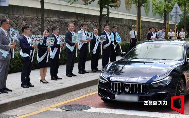 이상민 행정안전부 장관 등 참석자들이 29일 서울 중구 덕수초등학교 앞 어린이보호구역에서 어린이 교통안전 문화 정착을 위한 '일단멈춤, 아이먼저 보내주세요' 현장 캠페인을 하고 있다. 사진=조용준 기자 jun21@