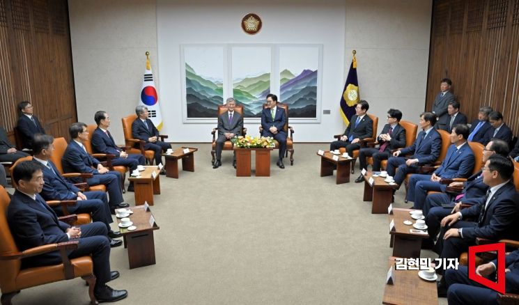 우원식 국회의장이 2일 국회에서 열린 제22대 국회 개원식 겸 정기회 개회식 사전환담에서 발언하고 있다. 왼쪽부터 김민기 국회사무총장, 최재해 감사원장, 노태악 중앙선거관리위원장, 한덕수 국무총리, 이종석 헌법재판소장, 조희대 대법원장, 우원식 국회의장, 이재명 더불어민주당 대표, 한동훈 국민의힘 대표, 조국 조국혁신당 대표, 이학영 국회부의장, 주호영 국회부의장, 박찬대 더불어민주당 원내대표. 사진=김현민 기자 kimhyun81@