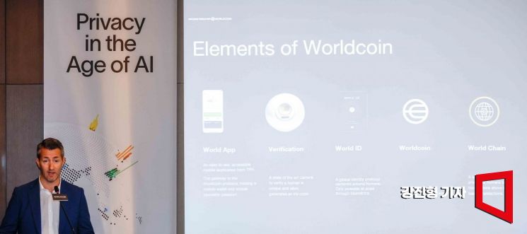 데미안 키어런 툴스 포 휴머니티 최고 개인정보보호책임자가 4일 서울 중구 플라자호텔에서 열린 '2024 AI 시대 개인정보 보호 정책 기자간담회'에 참석해 기조연설 하고 있다. 툴스 포 휴머니티는 '월드코인' 프로젝트를 위한 툴을 개발하는 기술 기업이다.