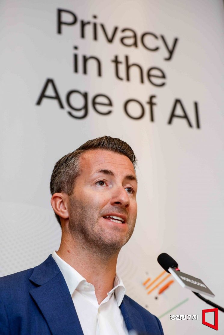 데미안 키어런 툴스 포 휴머니티 최고 개인정보보호책임자가 4일 서울 중구 플라자호텔에서 열린 '2024 AI 시대 개인정보 보호 정책 기자간담회'에 참석해 기조연설 하고 있다. 툴스 포 휴머니티는 '월드코인' 프로젝트를 위한 툴을 개발하는 기술 기업이다.