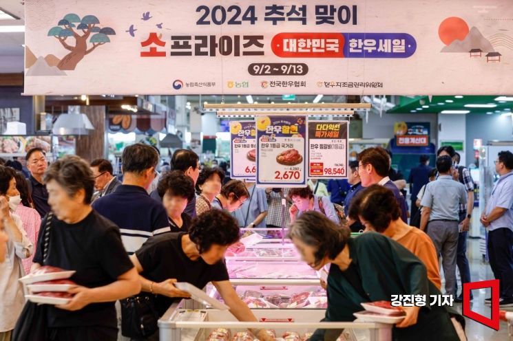 민족 대명절 추석을 앞두고 있는 5일 서울 서초구 하나로마트 양재점을 찾은 고객들이 한우를 구매하고 있다.