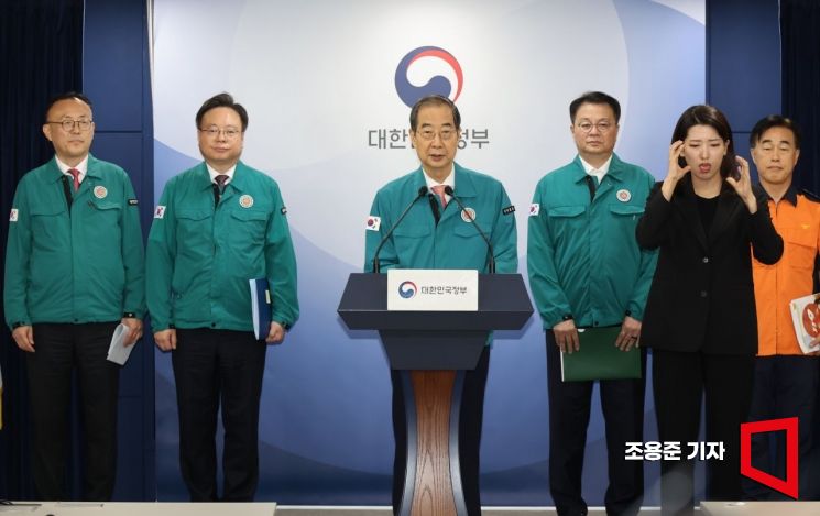 한덕수 국무총리가 12일 서울 종로구 정부서울청사에서 열린 '관계부처 합동 응급의료 종합상황 브리핑'에 참석, 추석연휴 응급의료 관련 발표를 하고 있다. 이날 브리핑에는 조규홍 보건복지부 장관, 방기선 국무조정실장, 이한경 재난안전관리본부장, 허석곤 소방청장이 배석했다. 사진=조용준 기자 jun21@