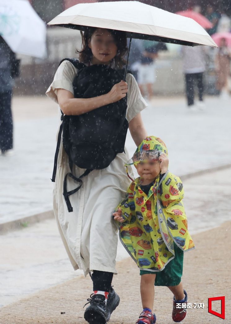 전국적으로 비가 내린 20일 서울 종로 경복궁을 찾은 관광객들이 비를 피해 이동하고 있다. 기상청은 21일까지 전국적으로 많은비가 내리고 나면 더위가 한풀 꺽일것으로 예보했다. 사진=조용준 기자 jun21@