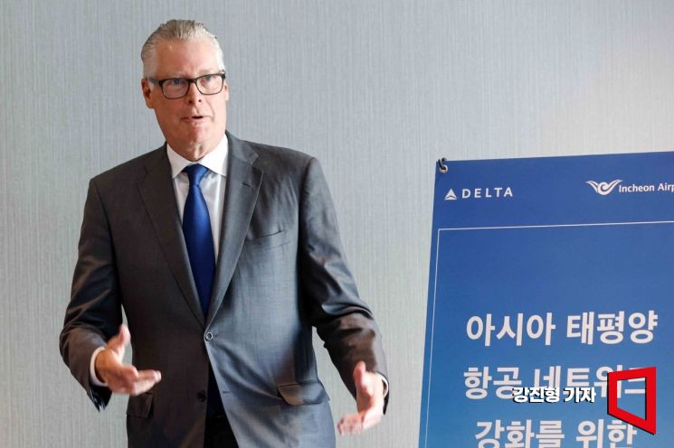 에드 바스티안 델타항공 회장이 현지시각 25일 미국 애틀랜타 로우스 호텔에서 열린 '아시아 태평양 항공 네트워크 강화를 위한 전략적 논의'에 참석해 이학재 인천국제공항공사 사장과 인사한 뒤 발언 하고 있다.