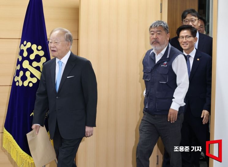 4일 서울 대통령 직속 사회적 대화기구 경제사회노동위원회에서 열린 노사정대표자 회의에서 손경식 한국경영자총협회(왼쪽부터), 김동명 한국노총위원장, 김문수 고용노동부 장관, 권기섭 경사노위 위원장이 입장하고 있다. 노사정 4인 대표자 회의는 사회적 대화의 본격적인 재개를 앞두고 지난해 12월 14일 열린 비공개 회의 이후 약 10개월 만이며, 지난달 김문수 장관과 권기섭 위원장이 취임한 후 처음이다. 사진=조용준 기자 jun21@