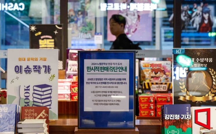 22일 서울 마포구 교보문고 합정점에 2024 노벨문학상 수상 작가인 한강 도서의 한시적 판매 중단 안내문이 걸려 있다. 교보문고는 지역서점과의 상생을 위해 이달 말까지 한강 작가의 도서 판매를 일부 매장에서 중단한다고 밝혔다.