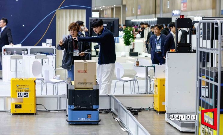 23일 경기 고양 킨텍스 제1전시장에서 열린 '2024 로보월드'에서 물류로봇이 시연을 펼치고 있다.