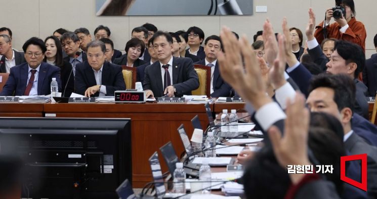 국회 과학기술정보방송통신위원회 야당 의원들이 24일 국회에서 열린 방송통신위원회 및 소관 감사대상기관에 대한 종합감사에서 김태규 방송통신위원장 직무대행에 대한 국회모욕죄 고발 안건에 거수 표결을 하고 있다. 김 직무대행은 오전 감사 중 방문진 직원이 쓰러지자 ″XX, 다 죽이네″라고 말해 논란이 됐다.