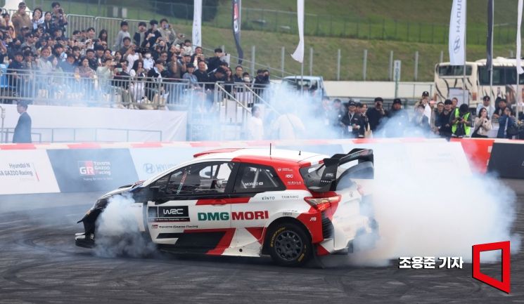 27일 경기도 용인시 에버랜드 스피드웨이에서 열린 '현대 N x 토요타 가주 레이싱(Hyundai N x TOYOTA GAZOO Racing) 페스티벌'에서 정의선 현대자동차그룹 회장과 도요다 아키오 일본 도요타자동차그룹 회장이 스페셜 쇼런을 하고 있다. 운전석이 아키오 회장, 조수석은 정의선 회장.