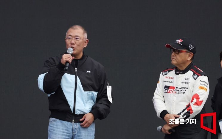7일 경기도 용인시 에버랜드 스피드웨이에서 열린 '현대 N x 토요타 가주 레이싱(Hyundai N x TOYOTA GAZOO Racing) 페스티벌'에서 정의선 현대자동차그룹 회장과 도요다 아키오 일본 도요타자동차그룹 회장이 스페셜 쇼런을 마친 후 인사하고 있다.