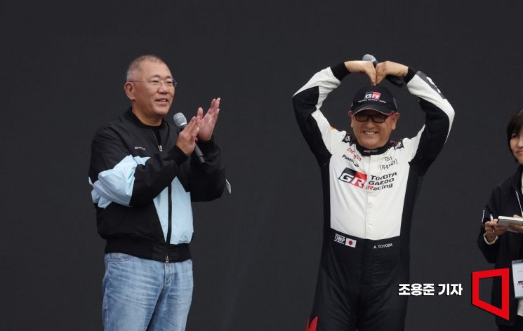7일 경기도 용인시 에버랜드 스피드웨이에서 열린 '현대 N x 토요타 가주 레이싱(Hyundai N x TOYOTA GAZOO Racing) 페스티벌'에서 정의선 현대자동차그룹 회장과 도요다 아키오 일본 도요타자동차그룹 회장이 스페셜 쇼런을 마친 후 인사하고 있다.