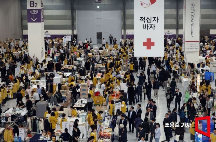 29일 서울 강남구 코엑스에서 열린 ‘2024 적십자 바자’ 행사장에서 시민들이 다양한 제품을 구매하고 있다. 대한적십자사가 매년 개최하는 적십자 바자회에선 식료품, 의류, 액세서리, 화장품 등 다양한 제품들이 저렴한 가격으로 판매되며, 수익금은 전액 위기 가정과 취약 계층을 돕는 데 사용된다.