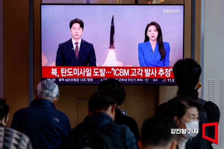 북한이 동해상으로 대륙간탄도미사일(ICBM)로 추정되는 탄도미사일 1발을 발사한 31일 서울역 대합실에서 시민들이 북한 미사일 발사 관련 뉴스를 시청하고 있다.